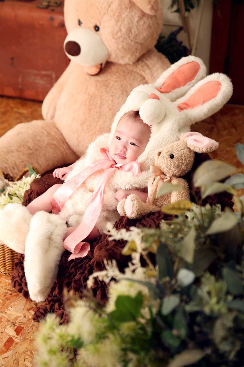 衣裳に合わせて異なるコンセプトのスタジオは、ベビーフォトも多彩に撮影致します。